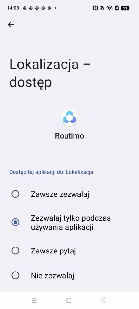 - Ustawienia dostępu aplikacji Routimo do lokalizacji,